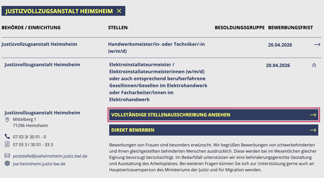 Sie sehen nun den Text: Vollständige Stellen-Ausschreibung ansehen.